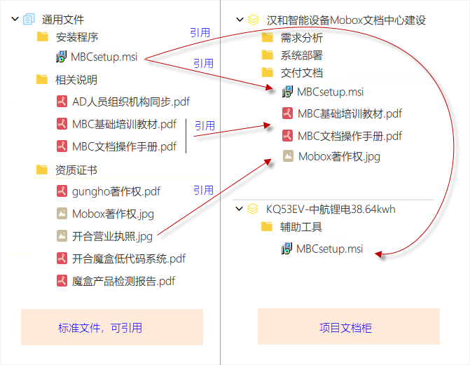這種管理方式好處是簡單,壞處是無法體現這是一個相同的文件。Mobox文檔管理系統可以很好的管理這類文件。我們的相同文件存放在不同的文件夾,采用了引用文件的方式來管理。