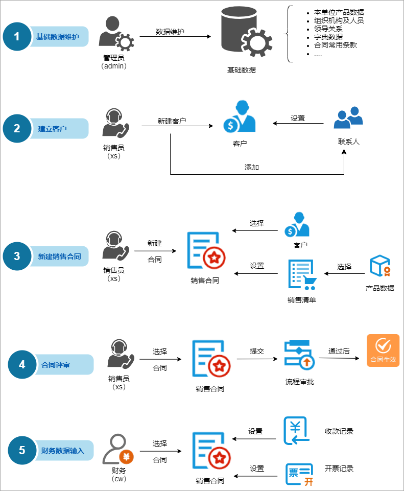 合同軟件涉及的企業員工角色:銷售、采購、管理員、主管、財務。以下是各個角色主要需要做的事情。