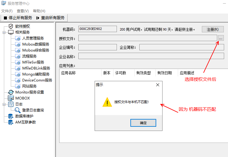 2)授權(quán)文件的機器碼與當(dāng)前服務(wù)器的機器碼不一致(注冊的時候會出現(xiàn))
