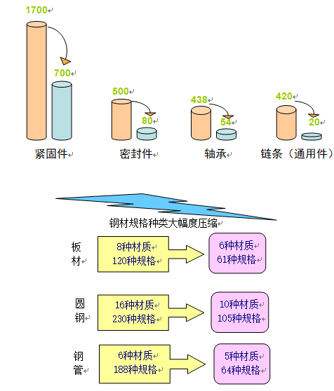 下圖是國(guó)內(nèi)某叉車集團(tuán)在實(shí)施PDM系統(tǒng)前后對(duì)標(biāo)準(zhǔn)件、通用件、材料規(guī)格數(shù)量的一個(gè)對(duì)比。